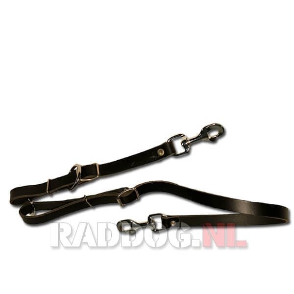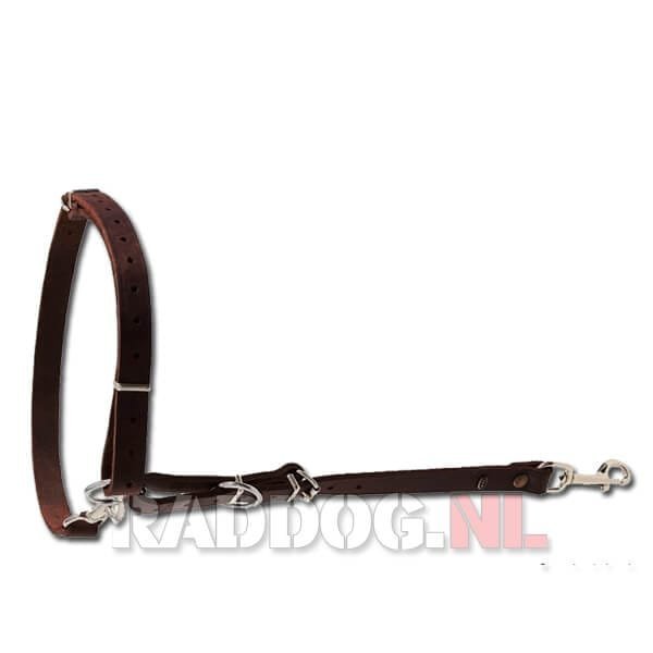 Het speurtuig koppelt u de speurlijn onder bij de buik aan, net achter de ribbenkast. Dit speurtuig zit verbonden aan een lederen halsband of schakelketting. Het tuig mag aan zitten maar zeker niet te strak.