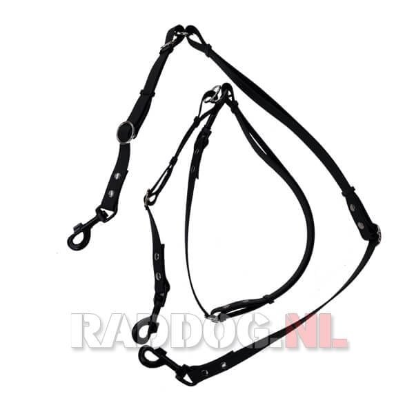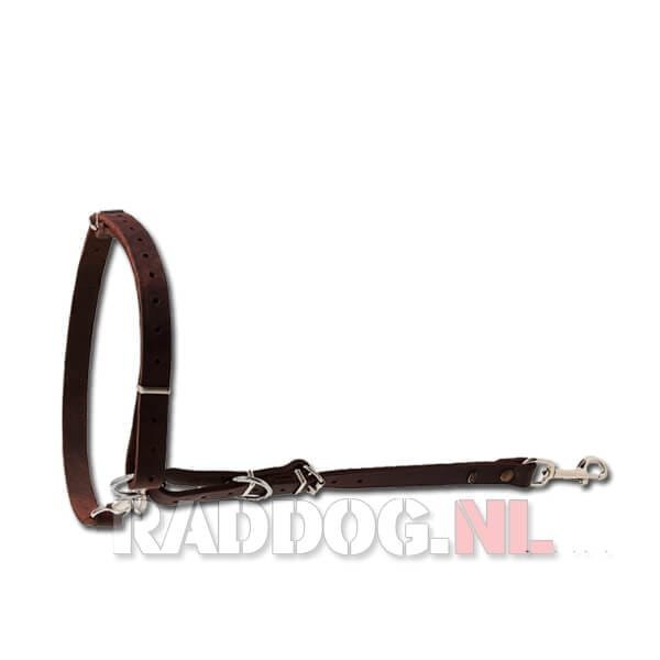 Het speurtuig koppelt u de speurlijn onder bij de buik aan, net achter de ribbenkast. Dit speurtuig zit verbonden aan een lederen halsband of schakelketting. Het tuig mag aan zitten maar zeker niet te strak.