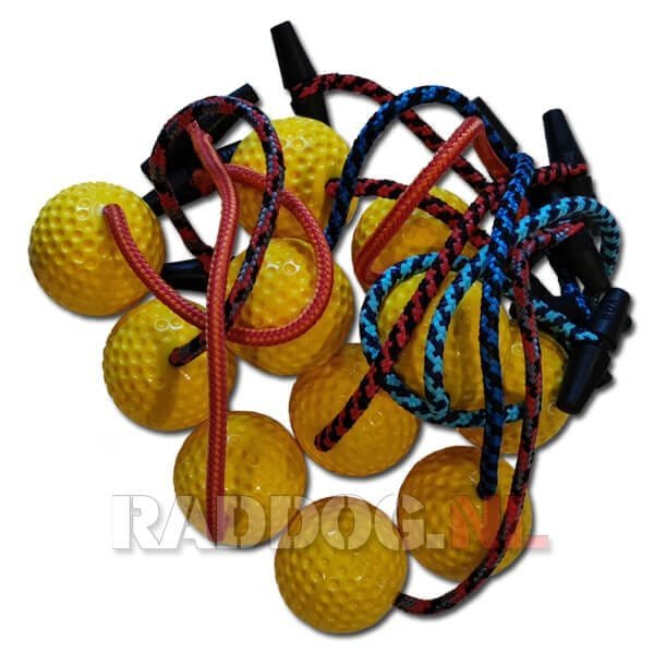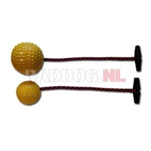 De drijfbal geel met lang koord en klosje is in verschillende maten verkrijgbaar. De meest gebruikte is de M met een doorsnede van ø 7cm. Tot slot is er een L. Deze heeft een afmeting van ø 9cm. Deze wordt niet veel gebruikt tijdens de training maar meer om mee te spelen of zijn aandacht te trekken.