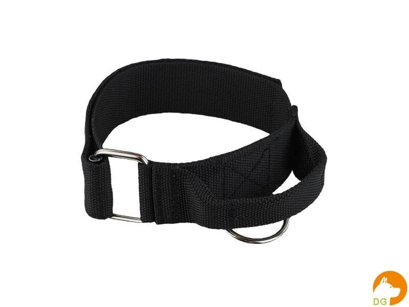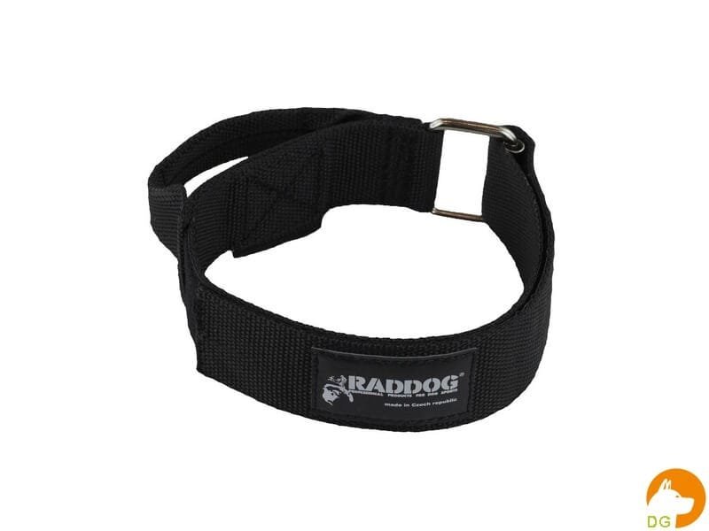 Raddog heeft een Nylon halsband met handvat en een stevige metalen ring.
