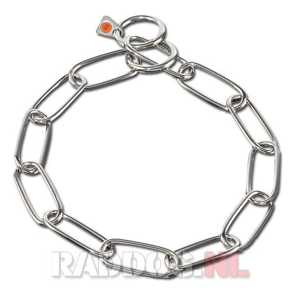 Het grote voordeel van deze lange schakels is dat deze zeer vriendelijk zijn voor de vacht van de hond. Dus ook geschikt voor honden met een lange vacht. De grote schakels hebben een minder groot snij effect dan bijvoorbeeld een halsband met kleine schakels. Voor een optimale sterkte zijn de schakels door en door gelast.
