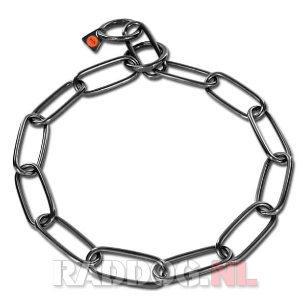 De Sprenger RVS zwart schakelketting met grote schakels voor de hond. Daardoor is deze geschikt voor middelgrote en grote rassen. Ook is het Ideaal voor langharige honden, met langwerpige schakels die zijn ontworpen om het vangen en trekken van vacht te voorkomen.